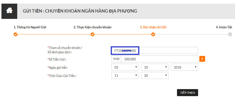 - Quay lại trang gửi tiền của 188BET, điền dãy Số Giao Dịch (bao gồm chữ FT) vào mục "Tham số chuyển khoản / Số lệnh giao dịch" và các thông tin cần thiết khác. Sau đó Tiếp Tục và hoàn tất, như ví dụ bên dưới: