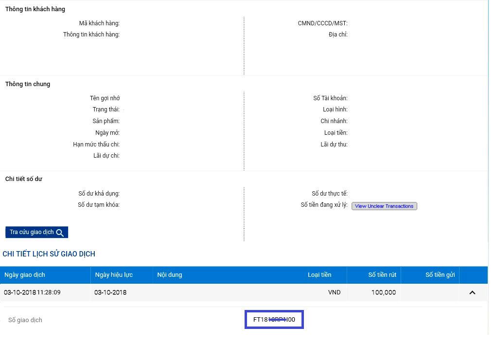 - Sau khi chuyển khoản thành công, "Số giao dịch" sẽ hiển thị tại mục Chi Tiết Giao Dịch như bên dưới: