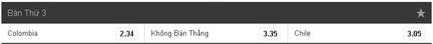 - Với ví dụ từ bảng cược trên, dựa trên kết quả thực trước đó của trận đấu, ở thời điểm hiện tại Quý Khách có thể đặt cược cho “Bàn Thứ 3” của trận đấu được ghi bởi Colombia, hoặc Chile, hoặc không có bàn thắng thứ 3.