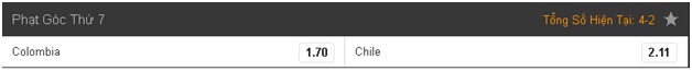- Với ví dụ từ bảng cược trên, dựa trên kết quả thực trước đó của trận đấu, ở thời điểm hiện tại Quý Khách có thể đặt cược cho “Phạt Góc Thứ 7” của trận đấu được ghi bởi Colombia hoặc Chile.